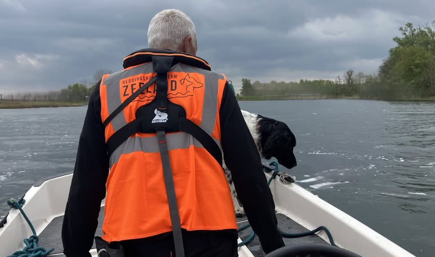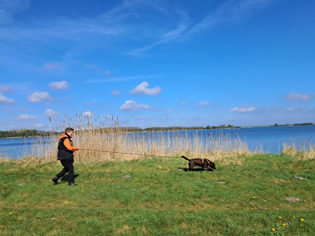 Op de foto zie je hoe goed Mellow daarmee bezig is. Hij volgt het unieke geurpatroon van de vermiste. Wij weten inmiddels aardig welke lichaamshouding Mellow in diverse