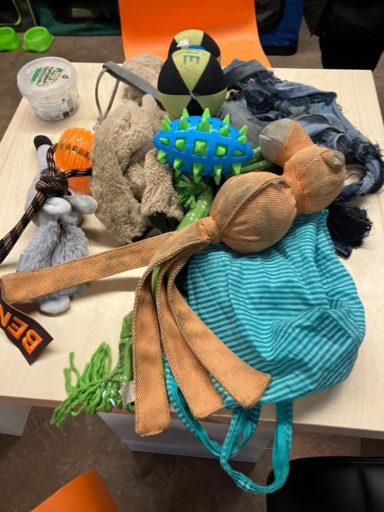 Dit zijn alle speeltjes/voerdummy’s die bij het begin van een training gereedliggen om straks in een tasje te verdwijnen. Meestal zijn er op een training in gebouwen/puin meerdere van die tasjes, voor ieder “vermiste” één. Van iedere hond één speeltje/ voerdummy per tas. De honden vinden in één zoekronde namelijk vaak meerdere “vermisten”.