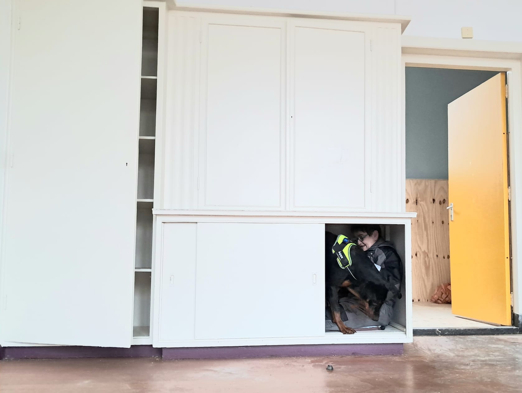 Op de foto is de vindplaats gelokaliseerd en de deur geopend door de hond. De kast is toch nog zo groot dat de hond helemaal bij de oefenvermiste is gekropen. Wat knap van deze jonge hond die nog maar net in opleiding is en wat heeft de oefenvermiste goed werk geleverd.