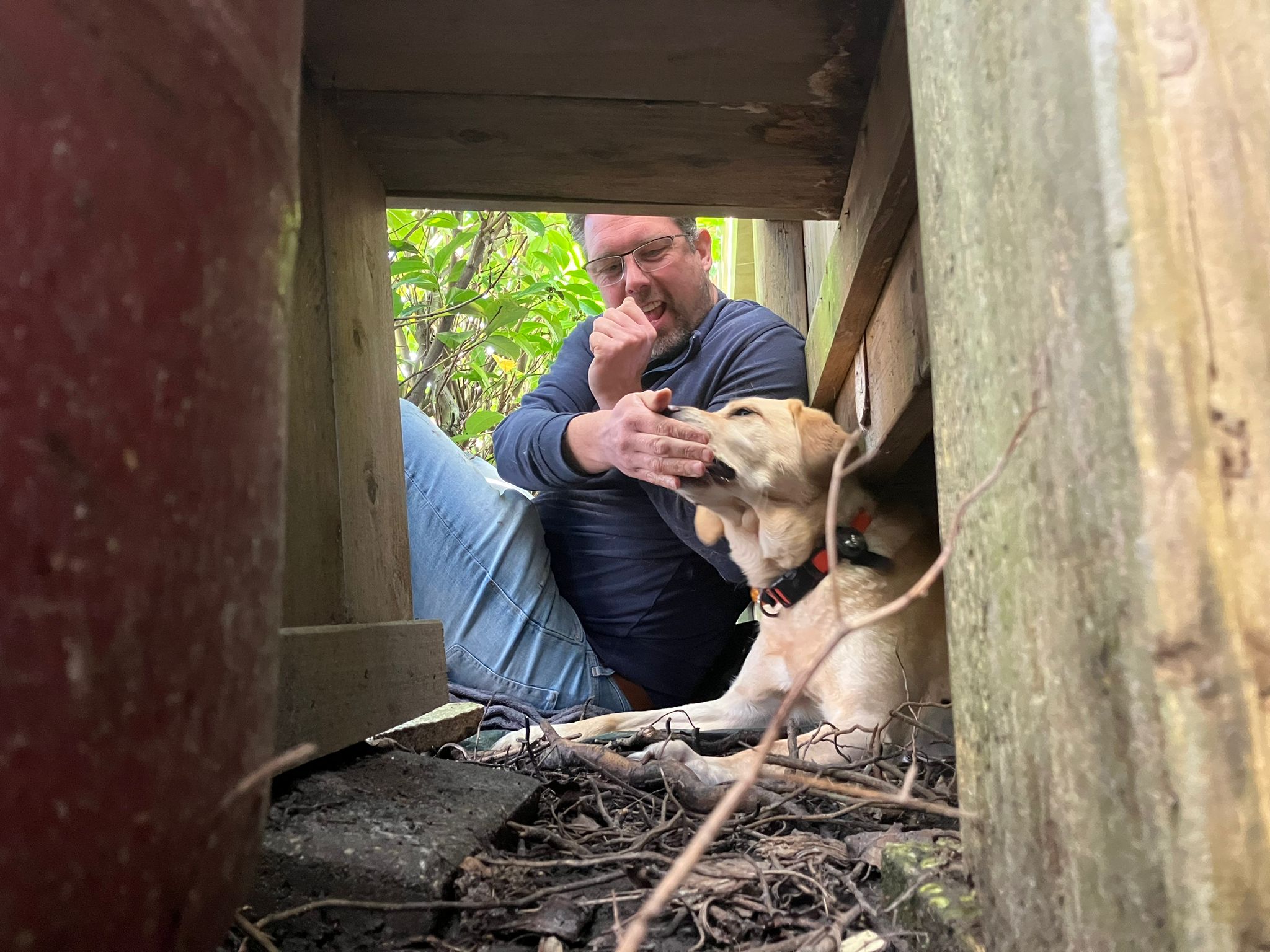 Foto: Kim SikkensTe zien is dat de hond wordt beloond door oefenvermiste, nadat deze door haar is gevonden.
